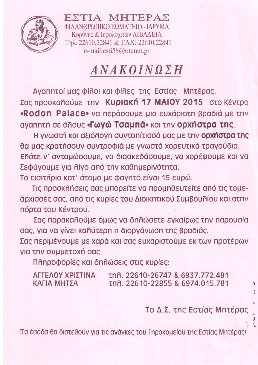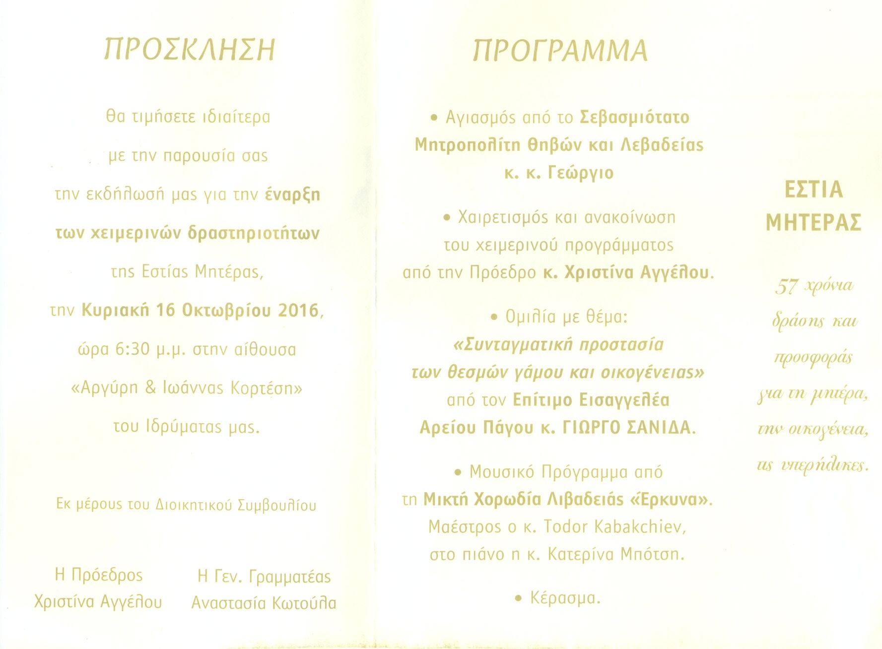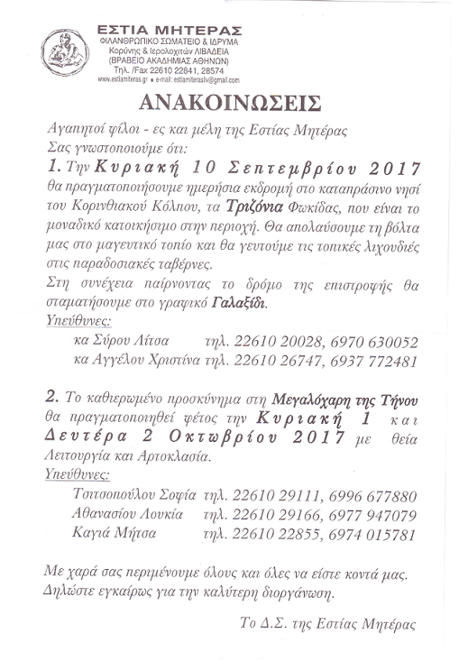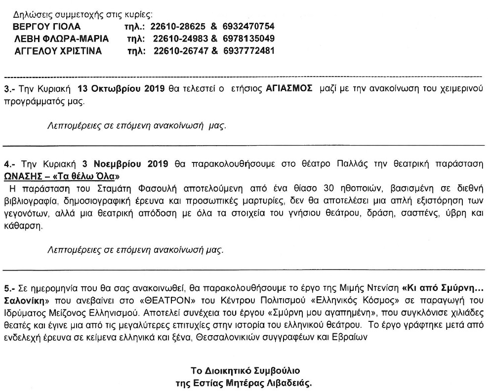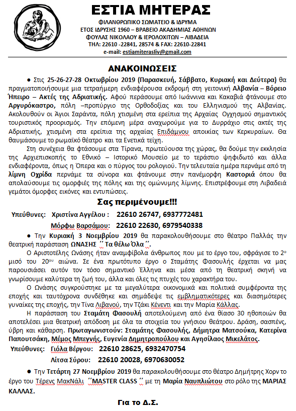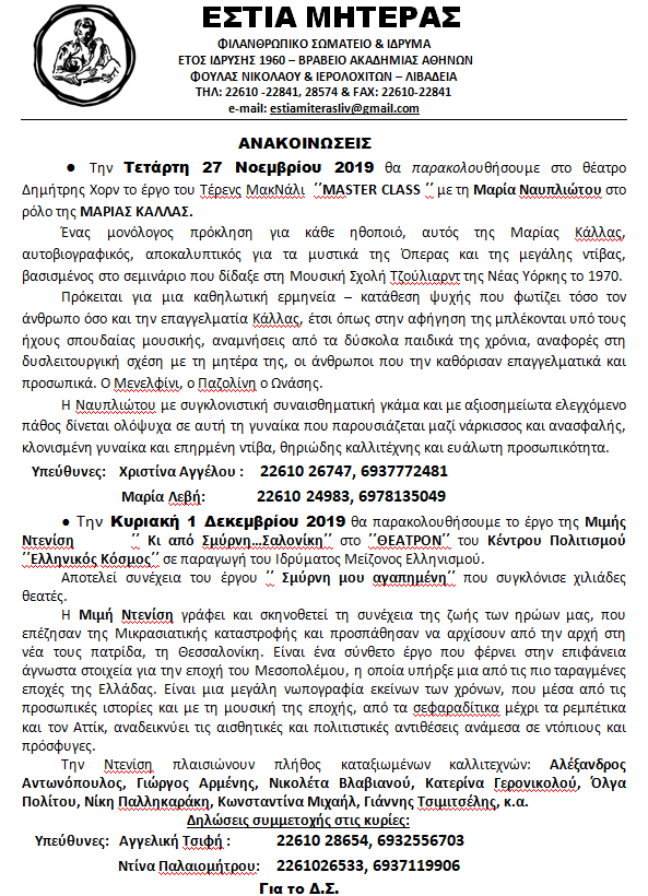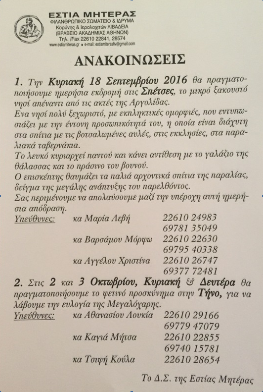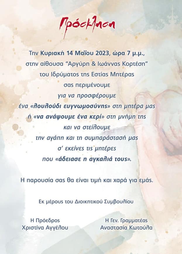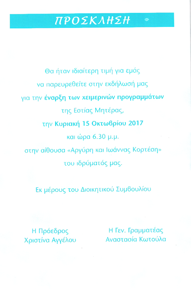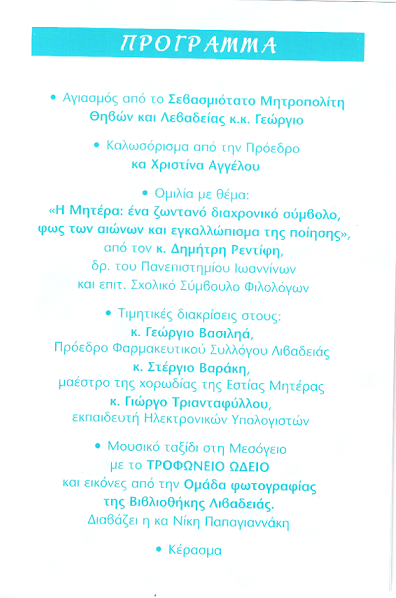 | Η ιστορία μας | ΠΑΛΑΙΟΤΕΡΕΣ ΕΚΔΗΛΩΣΕΙΣ Παρακάτω βλέπετε, μέρος από τις ανακοινώσεις από τις παλιότερες εκδηλώσεις της Εστίας Μητέρας, χωρισμένες ανά χρονιές |
